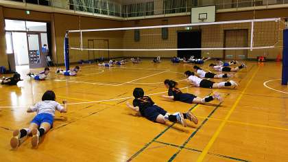 家庭訪問の放課後、体育館ではバレーボール部がトルーニングから練習をはじめています。