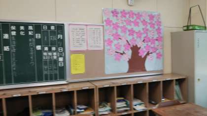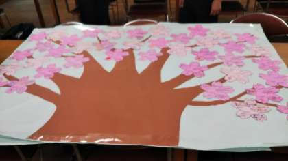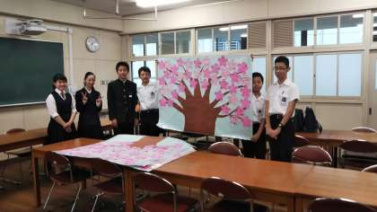 各クラス、文化委員とボランティア1名の人が桜の樹に、自己紹介の桜の花を咲かせてくれました。