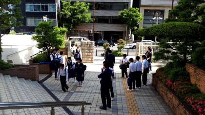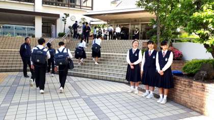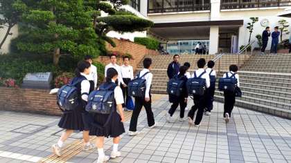生徒会の大きなあいさつが正門で響いています!