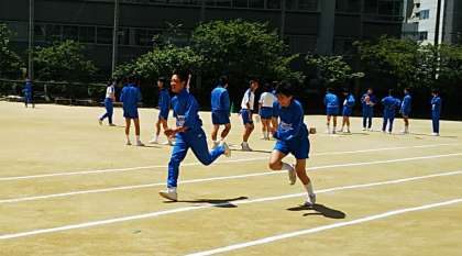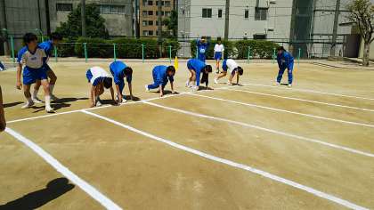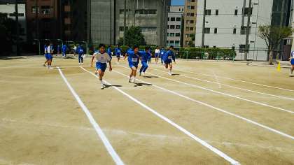 晴れ渡る運動場で、体力テストに向けて一生懸命に体を動かしています。