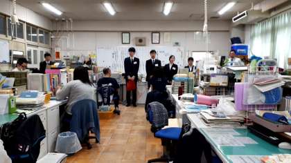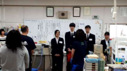 職員集会で、4人の教育実習生の紹介があり、代表の方からのごあいさつがありました。3週間よろしくお願いいたします。