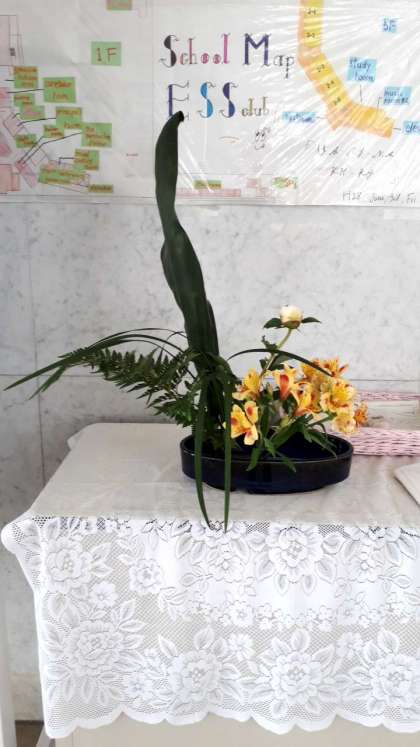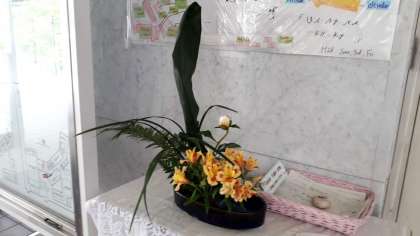 今回のテーマは「緑色濃く」です。レモンリーフ、レザーファン、荀華、アリストロメリアの草花の調和がとれていて美しいです。