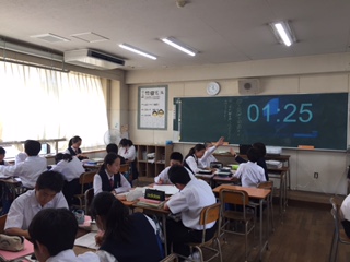 また、言語活動を実施、制限時間もプロジェクターで提示しています。