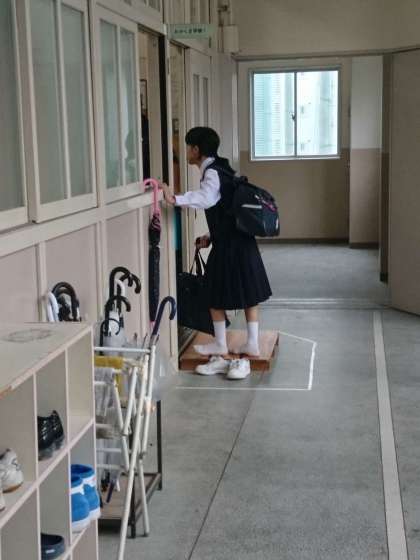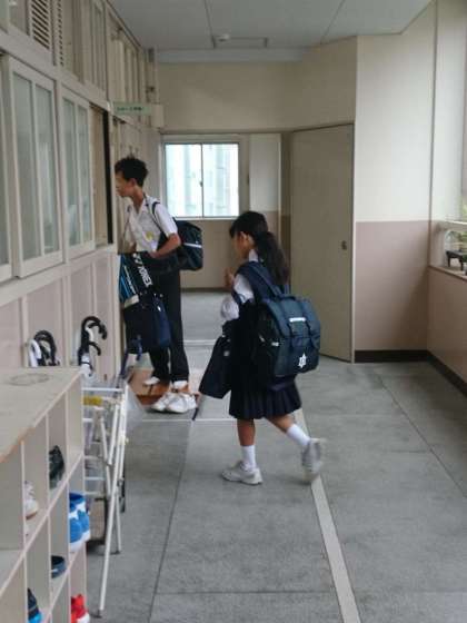 教室にいる先生や友達にあいさつをしています。今日も1日がんばりましょう。