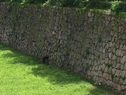桜門付近の東空堀石垣にある地下壕出入り口の跡です。わかりにくいので、覗き込んで、探しています。