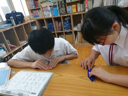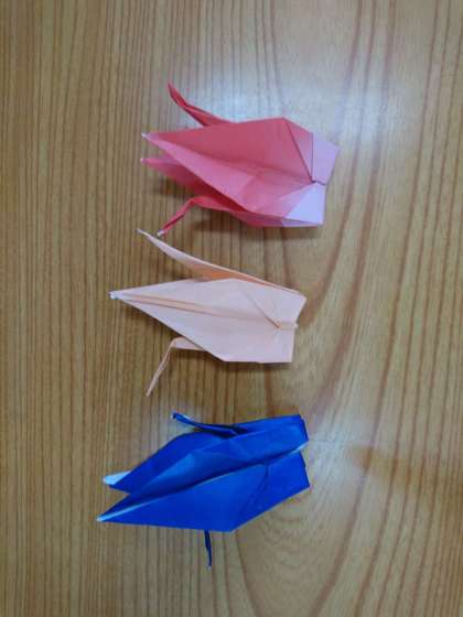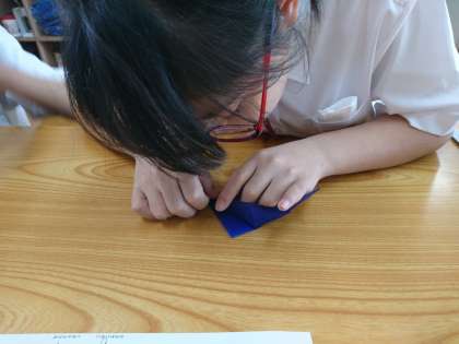 先週に引き続き、授業のなかで、鶴の折り方を確認しました。先週よりも、「ここはどうすれば良いですか?」といった質問が少なくなりました。集中しています!