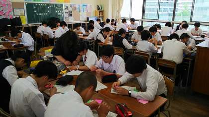 朝、3年生の教室では各クラスの班長と折り鶴班長を中心に教えあい、平和への祈りを込めて折り鶴を作成しています。