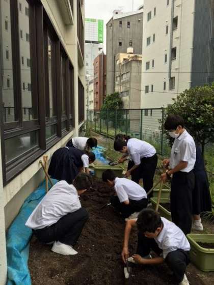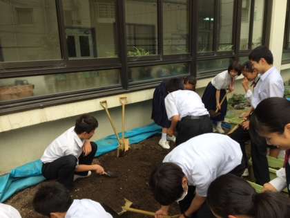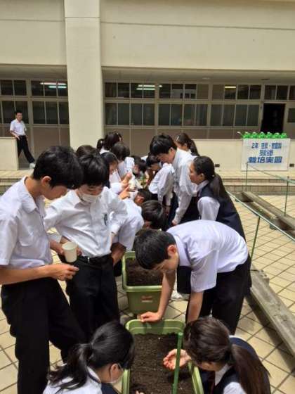 技術分野では大阪シロナを栽培します。今日はプランターに土を入れる作業と種まきをしました。