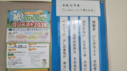 3年生の掲示板に「いじめゼロ」を目指しての取り組みの1つとして、みんなで考えた俳句の優秀作品が掲示してありました。