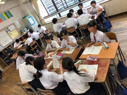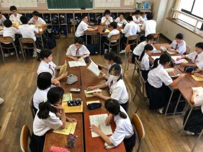 前半の係別会議が終了して各教室に戻り、後半は班ごとに係別会議の報告会がはじまりました。この係別会議報告会で一人ひとりが一泊移住の全てを知り準備を進めていきます。学年目標を達成するには絶対に必要な活動です。真剣に話し合いをしています。