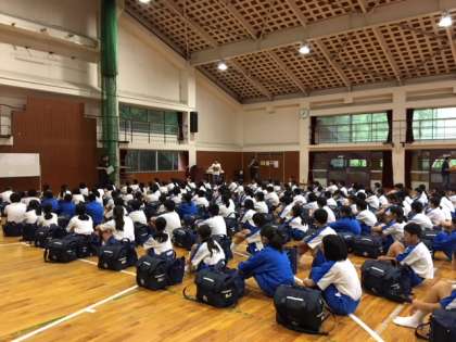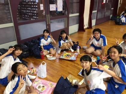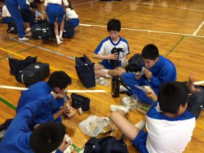 自然の家に到着しました。あいにくの雨で体育館にて昼食をとりましたが、みんな楽しそうですね。