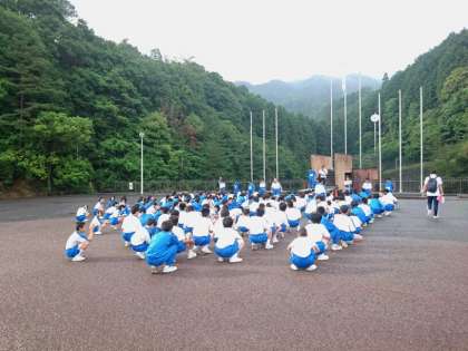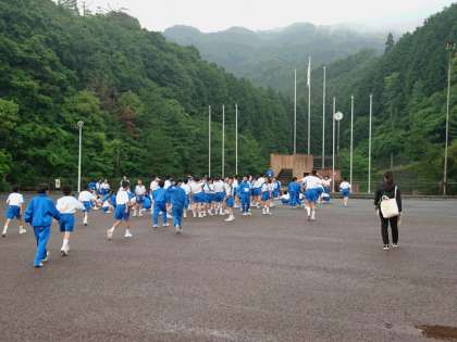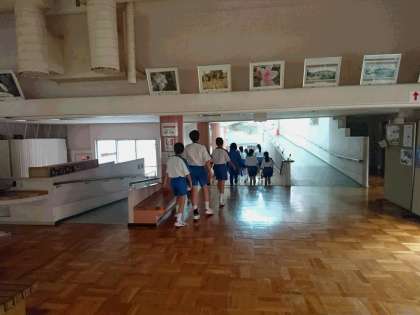 7時から行われる、朝のつどいに向け移動、整列しています。