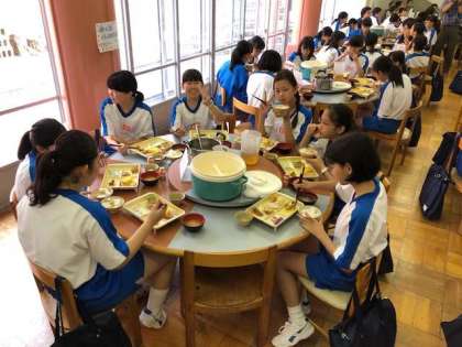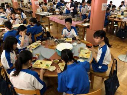 清掃活動も終わり時間通りに朝食スタートです。配膳も協力して行えています。朝から食欲旺盛です!