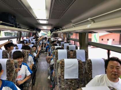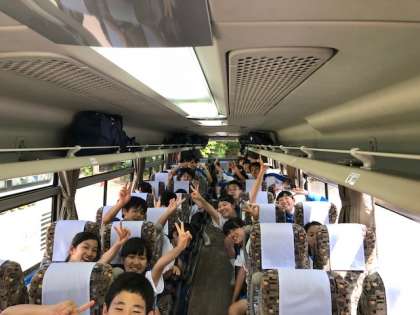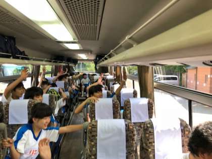 見送ってくれた自然の家の職員の皆様に手を振っています。