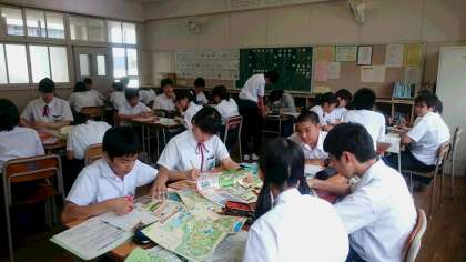 行ったことがない人が見てもわかる、つい読みたくなる壁新聞をめざして、黙々と取り組むクラス、班で話し合いながら取り組むクラス、様々です。