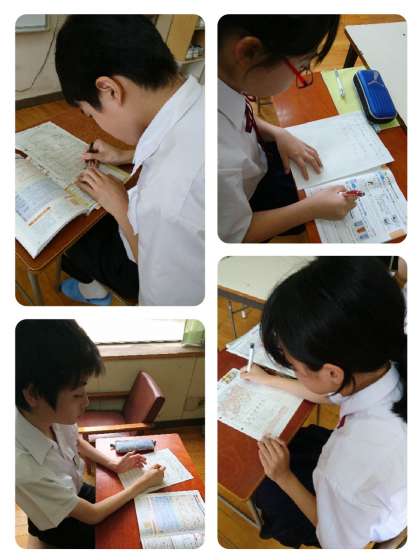 「教科書を貸してください。」「どのように調べたらいいですか?」などと、お願いしたり質問したりしながら、静かに学習しました。