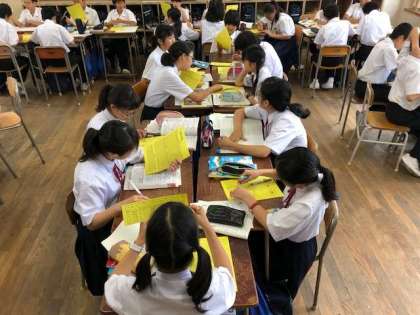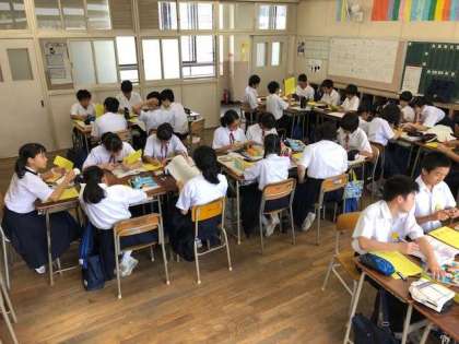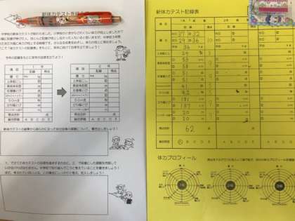 1時間目の1年5組の体育では、先日まで取り組んだ新体力テストのまとめを行なっています。自分の結果をカードにまとめ、レーダーチャートを使用して自分の体力面の課題を分析しています。新体力テストは中学校3年間、毎年チャレンジします。今年の結果を分析して、日々の計画を立て体力づくりに励み、来年は記録更新を目指します!頑張れ1年生!