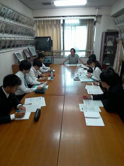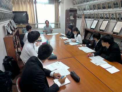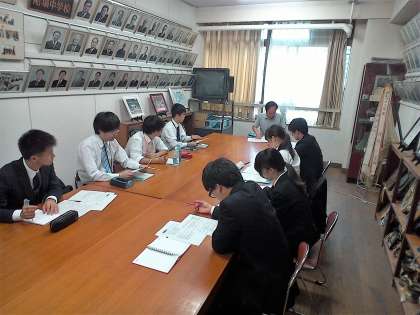 中学校の理科の教員を目指す実習生に対して、理科の教科主任の土井先生から理科教育についてお話しされています。