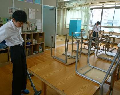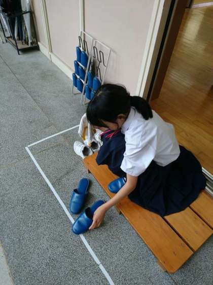 教室内をきれいにしました。保護者の方々に使っていただくスリッパも、ぞうきんで拭きました。