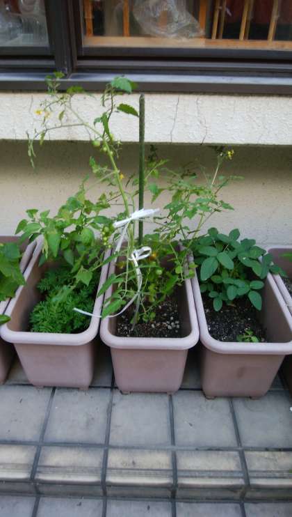 久しぶりの活動、今日はいろいろな作業をしました。これは、プランターに植えたトマトが大きく育ってきたため、添え木をした様子です。