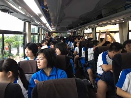 ホテルの方の見送りのに手を振り、バスは出発。あいにくの雨ですが牧島ペーロン会場に向かいます。