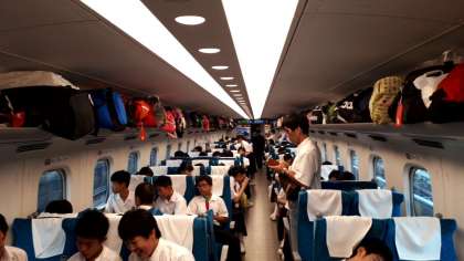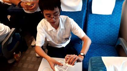 岡山駅を過ぎました。新大阪駅まで、あとわずかです。手品を披露してくれる東中生もいます!車内は変わらずにぎやかです。