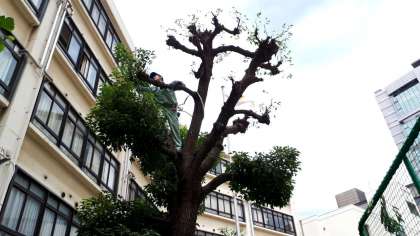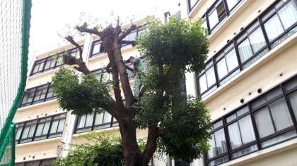 管理作業員さんが、巨木の剪定作業をしていただいています。