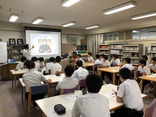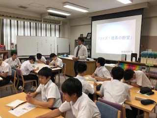 歴史では、クイズ形式で織田信長に関する講義が行われています。