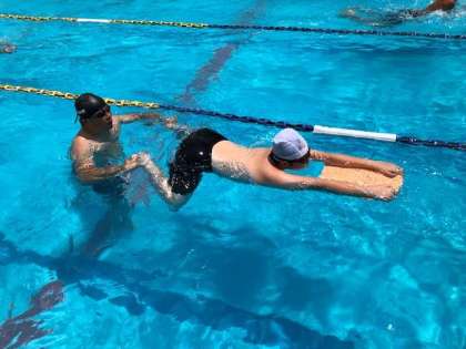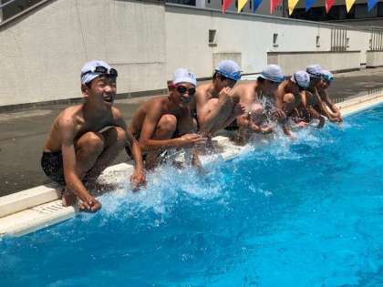本日も快晴の下に1年5組は元気いっぱいで水泳に取り組みました。今日は平泳ぎのフォームチェックを時間をかけて行いました!先生たちもプールに入り、熱血指導が展開されていました。頑張れ1年生!