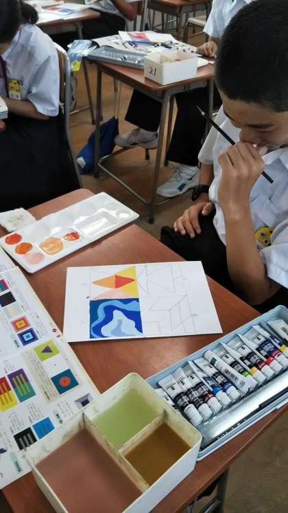 一年生の美術では、これまでに学習した平塗りの技術を使って、「暖かい」「重い」といった、感情に働きかける色を表現する課題に取り組んでいます。