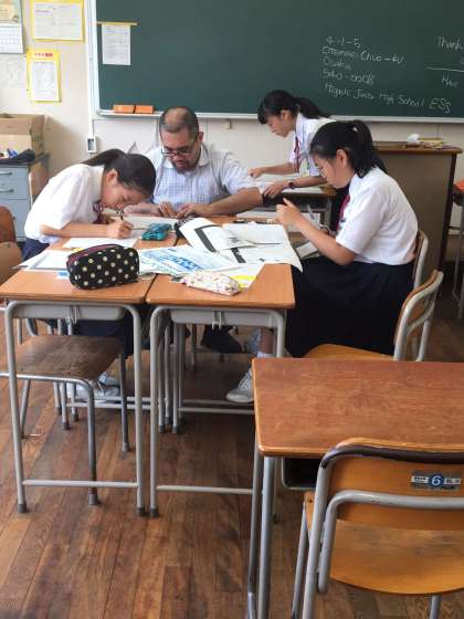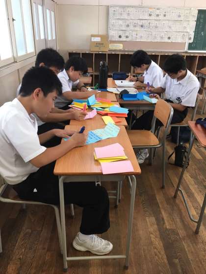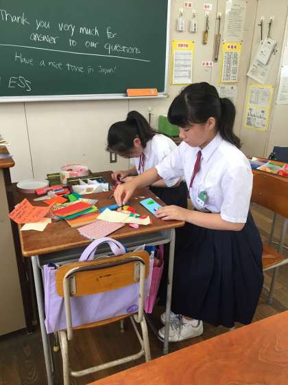 来週の活動の準備をしています。お礼に渡しているカードがなくなったので、作成しています。英語でメッセージを書き、折り紙で作った鶴と花を貼り付けています。とても好評です。