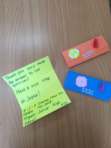 お礼に渡しているカードです。折り紙を貼って、日本らしいカードに仕上がっています。