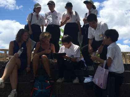 たくさん用意していたお礼のカードもほとんどなくなりました。最後はたまたま全員集合です。連日の猛暑に負けず、楽しくインタビュー活動ができました。大阪城でのインタビュー活動は今日で終わります。明日は、折り紙教室2日目です。インタビューと違って、応じてくださる方は少ないのですが、日本文化を紹介するいい機会です。頑張りましょう!たくさんの外国人の方が、来てくださいますように。