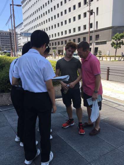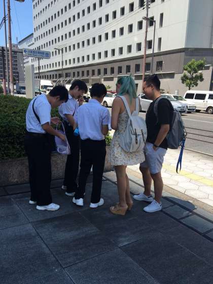 歴史博物館の前で、インタビューをし、そのあと折り紙教室の案内をしました。暑い中、男子が頑張って声をかけています。インタビューには応じてもらえるのですが、教室まで来てもらえた人は多くありませんでした。それでも来ていただいた方は、みなさん喜んでいらっしゃいました。