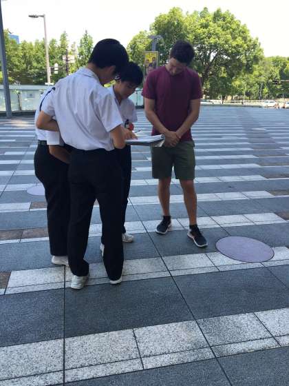夏休みの活動は今日で終わりです。先週月曜日から8日間、インタビューや折り紙教室を通して、決まったセリフではありますが、知らない外国の方と英語で会話をする練習をしてきました。この活動で、相当コミュニケーション力が鍛えられたと思います。猛暑の中、本当によく頑張りました。インタビューや折り紙教室の様子は、文化発表会で紹介する予定です。ESS部の頑張りをぜひご覧ください。