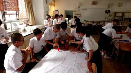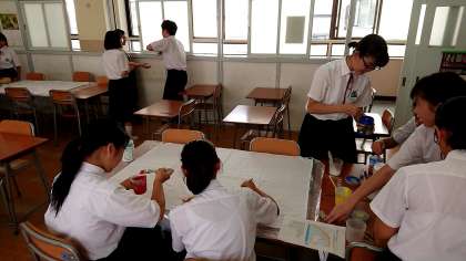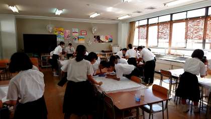本日より体育大会の取り組みとして、学級応援旗の作成、学級スローガンの作成、応援グッズ作りと、応援団長・副団長を中心に応援についての話し合いなどそれぞれに別れての活動を行っています。