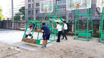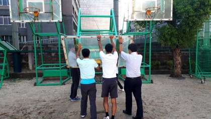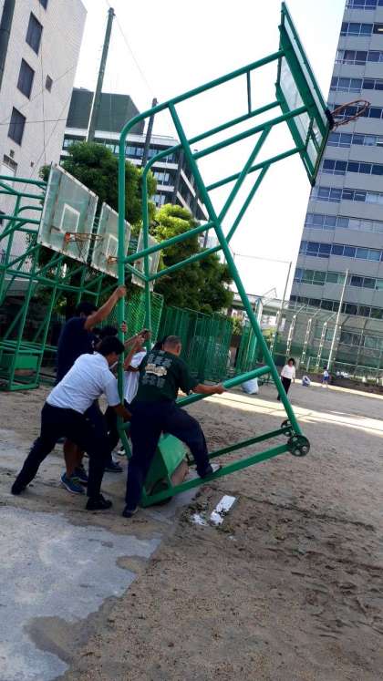 先生方も力を合わせて、バスケットゴールを復旧しています!