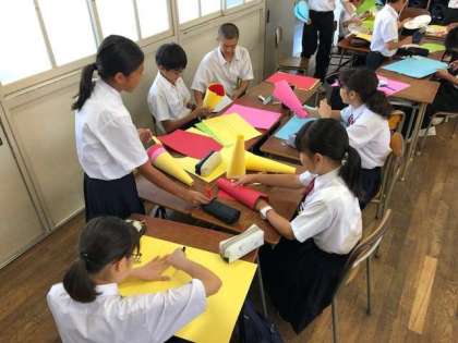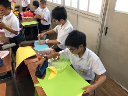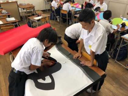 うちわ作り、スローガン、学級旗、応援歌などに分かれて取り組みが進んでいます。