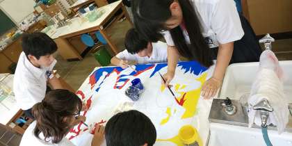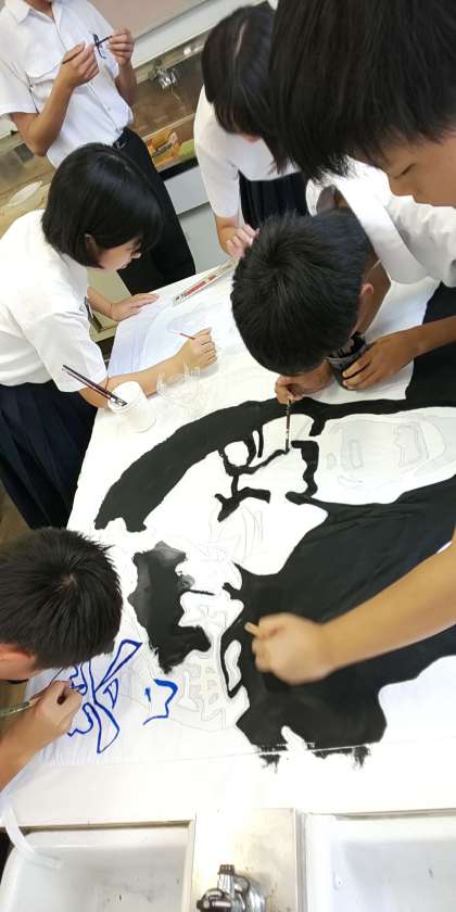 4クラスの学級旗作成係が理科室に一斉に集い、学級旗の作成に取り組んでいます。