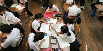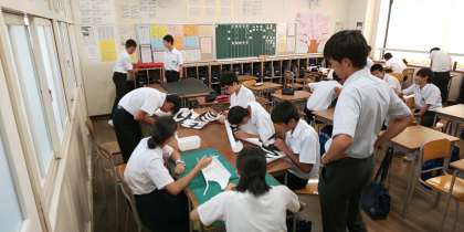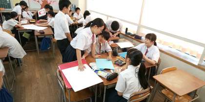 各学級では体育大会の役割ごとに別れて、応援練習、応援グッズ、学級旗の作成に取り組んでいます。