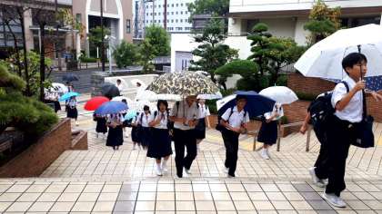 雨の中、東中生が元気に登校してきました。