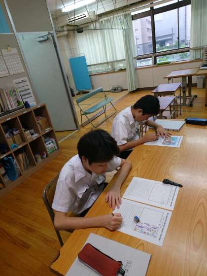 1限目は国語です。文化発表会で展示する絵日記(英語)を書くために、まずはどのような内容にするかを考えました。日本語を英語にして、アルファベットも丁寧に書いていきました。絵を描いて完成を目指します!