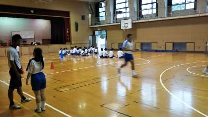 雨のために体育館とホールを使用して、体育大会に向けて、種目別に分かれて練習をしています!