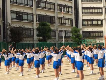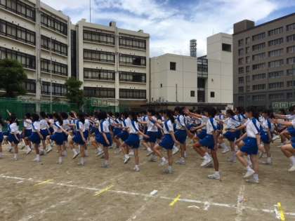 行進の練習、応援席の確認、東中体操の練習をしています。