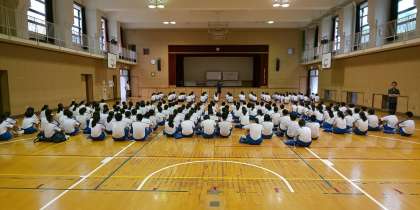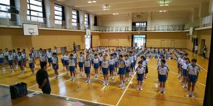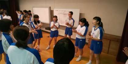 本日はあいにくの雨、体育大会実行委員会は、縦割り団別に応援練習に取り組んでいます。