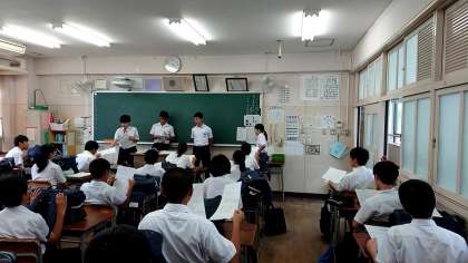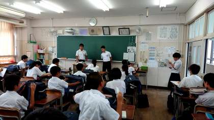 ただいま2年1組の終学活の時間に3年生の体育体育実行委員会が来ています!明日行われる縦割り応援に向けてのレクチャーとプリントの配布をして説明をしてくれました。しっかり覚えて協力しましょう!