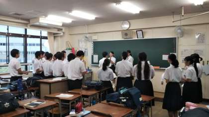 3階では、3年3組が応援歌の練習をしています。松村先生の歌声で、学級を先導しています。