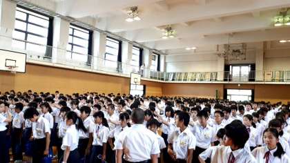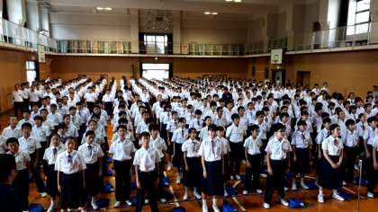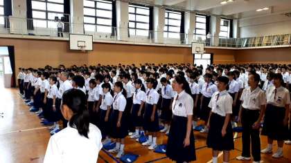 全校集会が始まります。東中生が体育館に集合してきました。先週から、全東中生による合唱練習が始まっています。全員が心を込めて、「東中校歌」を熱唱しましょう!