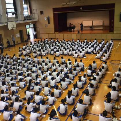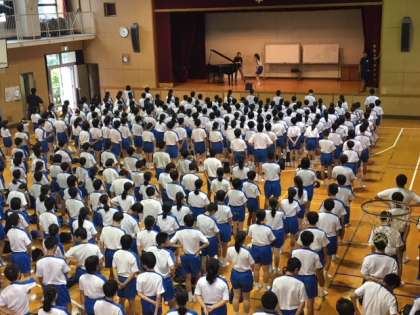 雨が降ってきたので体育館に移動し、校歌を練習しました。