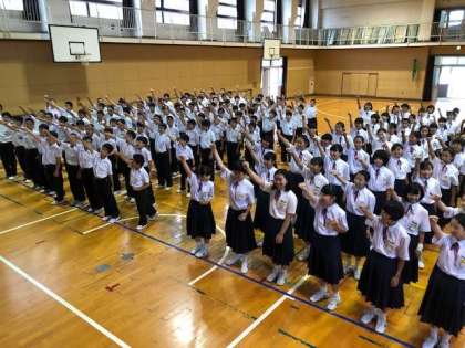 本日は4時間目に1年生5クラスが同時に体育の授業で学年種目の練習をするように予定されていましたが、あいにくの天気で体育館で実施することになりました。